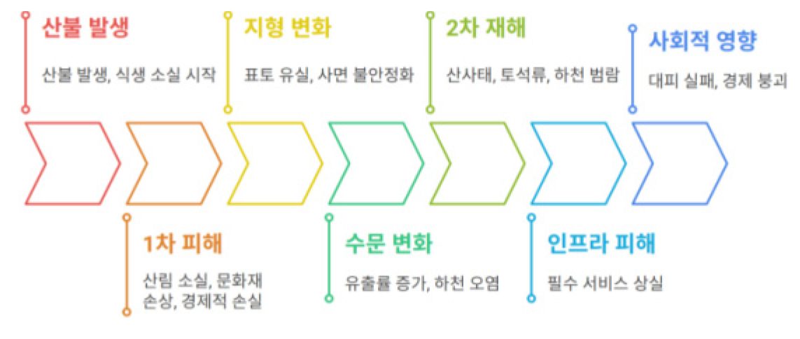 - Purpose: This study aims to multidimensionally analyze the damages caused by wildfires across environmental, economic, social, ecological, and health sectors, while identifying the impacts of secondary disasters(landslides and floods) on social infrastructure. Method: Drawing on international guidelines from the UNDRR and IPCC, as well as domestic legislation including the Forest Protection Act and the Framework Act on Disaster and Safety Management, damage types were classified. Quantitative analysis and legal system evaluation were performed using major wildfire cases in Korea from 2019 to 2025. Result: Results indicate that wildfires induce changes in topographic and hydrological environments, triggering cascading damages to infrastructure like roads, rivers, and communication networks. Notably, the 2025 Uiseong wildfire exhibited complex impacts, including 36,000 evacuees and cultural heritage losses, highlighting response limitations due to fragmented standards for individual disaster elements. Conclusion: In conclusion, effective management of wildfire-induced complex disasters requires shifting from firefighting-centric approaches to preemptive systems focused on multidimensional damage prediction and infrastructure protection. This necessitates revisions to construction standards, development restrictions in high-risk areas, and the implementation of real-time monitoring systems.