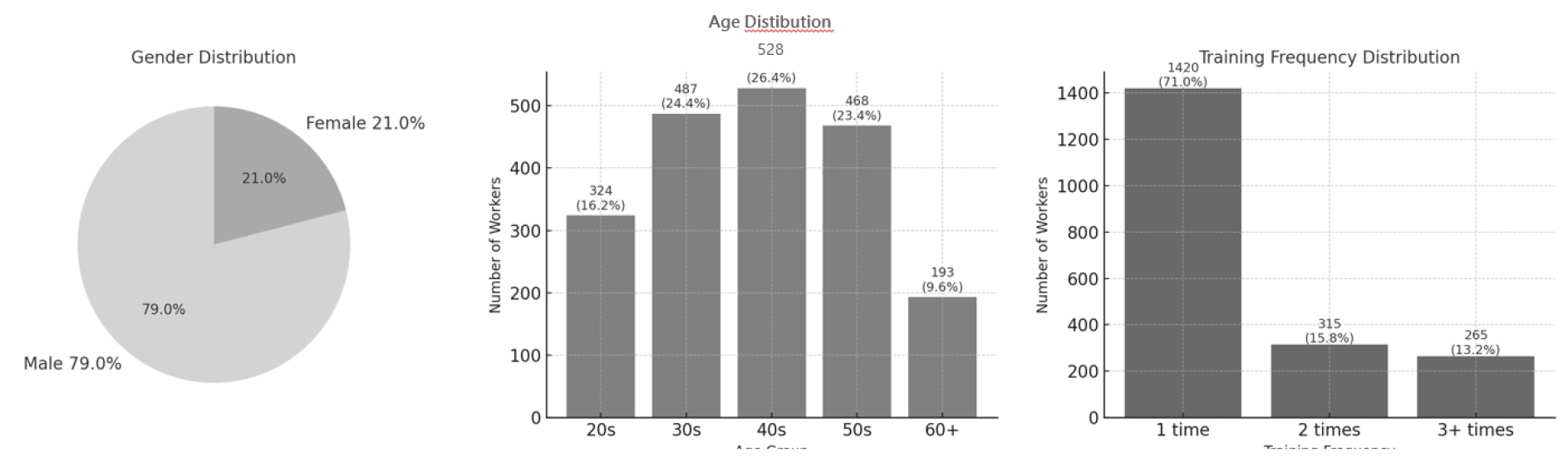 연구목적: 본 연구는 제조업 근로자의 기초안전 보수교육이 안전의식 향상에 미치는 영향을 실증적으로 규명하는 것을 목적으로 한다. 기존 연구는 일회성 교육의 효과에 집중되어 반복적·지속적 교육 효과 검증이 부족하였다. 연구방법: 2024년 9월부터 2025년 5월까지 제조업체 H사 협력업체 근로자 2,000명을 대상으로 설문조사를 실시하였다. 안전의식은 안전규정 이행(5문항)과 안전활동 태도(5문항)을 포함한 10문항 Likert 5점 척도로 측정하였다. Cronbach’s α=.947로 신뢰도가 검증되었으며, 다중회귀분석을 통해 교육횟수(1×, 2×, 3×)의 효과를 분석하였다. 연구결과: 1회 대비 2회 교육은 B=0.184(p=0.015), 3회 교육은 B=0.238(p=0.004)로 유의미한 향상 효과를 보였으며, 용량–반응 관계가 확인되었다. 성별과 연령은 경계 유의 수준에 불과했다. 결론: 반복적 보수교육은 근로자의 안전의식을 통계적으로 유의하게 향상시키며, 주기적·참여형 교육 모델의 제도화가 요구된다. 단일 기업 표본의 한계가 있으므로 다기관 종단연구가 필요하다.