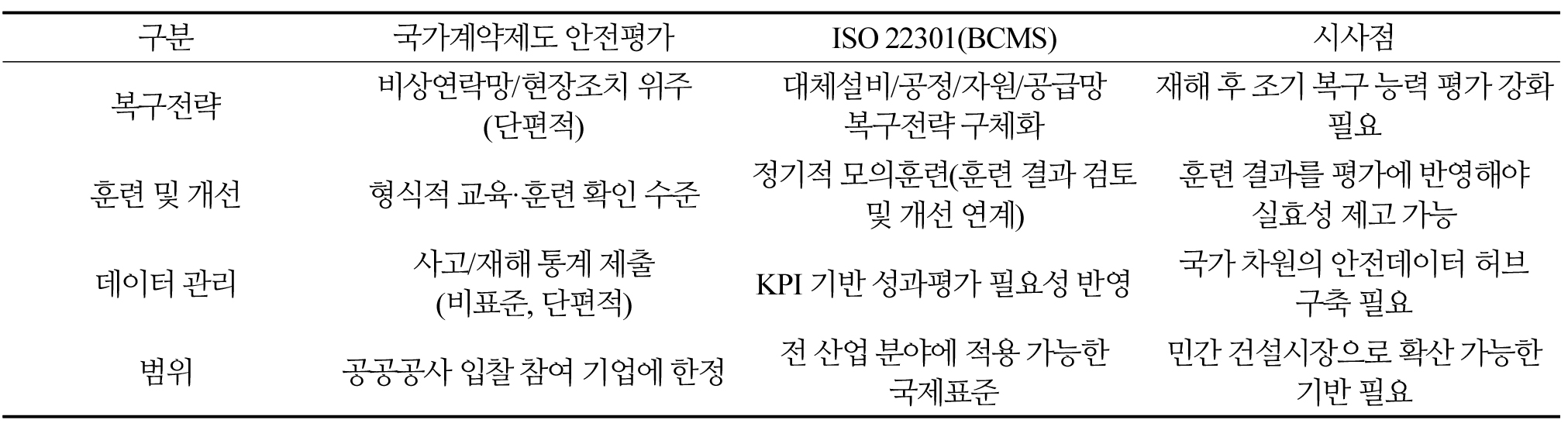 연구목적: 최근 국가계약제도 개선을 통해 공공 건설공사 전반에 안전평가가 의무화되었으나, 현행 안전평가는 법규 준수 여부 및 형식적 계획서 검토에 국한되어 있어 실질적인 재난 대응 및 공사 연속성 확보에 한계가 있다. 본 연구는 ISO 22301 기반의 비즈니스연속성관리시스템(BCMS)을 국가계약제도 안전평가에 연계하는 방안을 제시하는 것을 목적으로 한다. 연구방법: 문헌 분석과 사례 연구를 통해 현행 안전평가 제도의 한계를 도출하고, 리스크 평가(RA), 업무영향분석(BIA), 복구전략, 교육 ·훈련체계 등 BCMS 핵심 요소를 안전평가 항목에 연계 ·통합하는 평가 모델을 설계하였다. 연구결과: BCMS 요소를 국가계약제도 안전평가에 반영할 경우, 기존의 법규 준수 중심 평가에서 벗어나 건설공사의 재난 대응 및 복구 역량을 강화하는 종합적 평가체계로 발전할 수 있음을 확인하였다. 결론: 본 연구에서 제안한 연계 모델은 건설 안전관리의 실효성과 지속성을 제고할 수 있으며, 향후 건설안전특별법 시행령 및 국가계약법 개정을 통한 제도 개선과 실무 적용을 위한 기초자료로 활용될 수 있다.